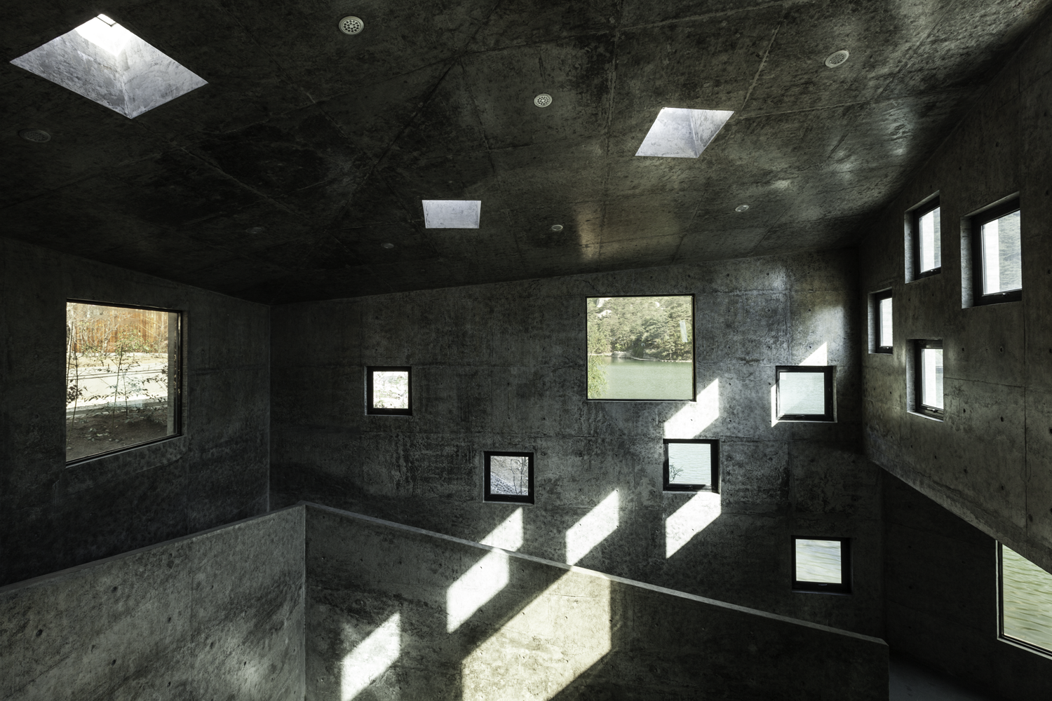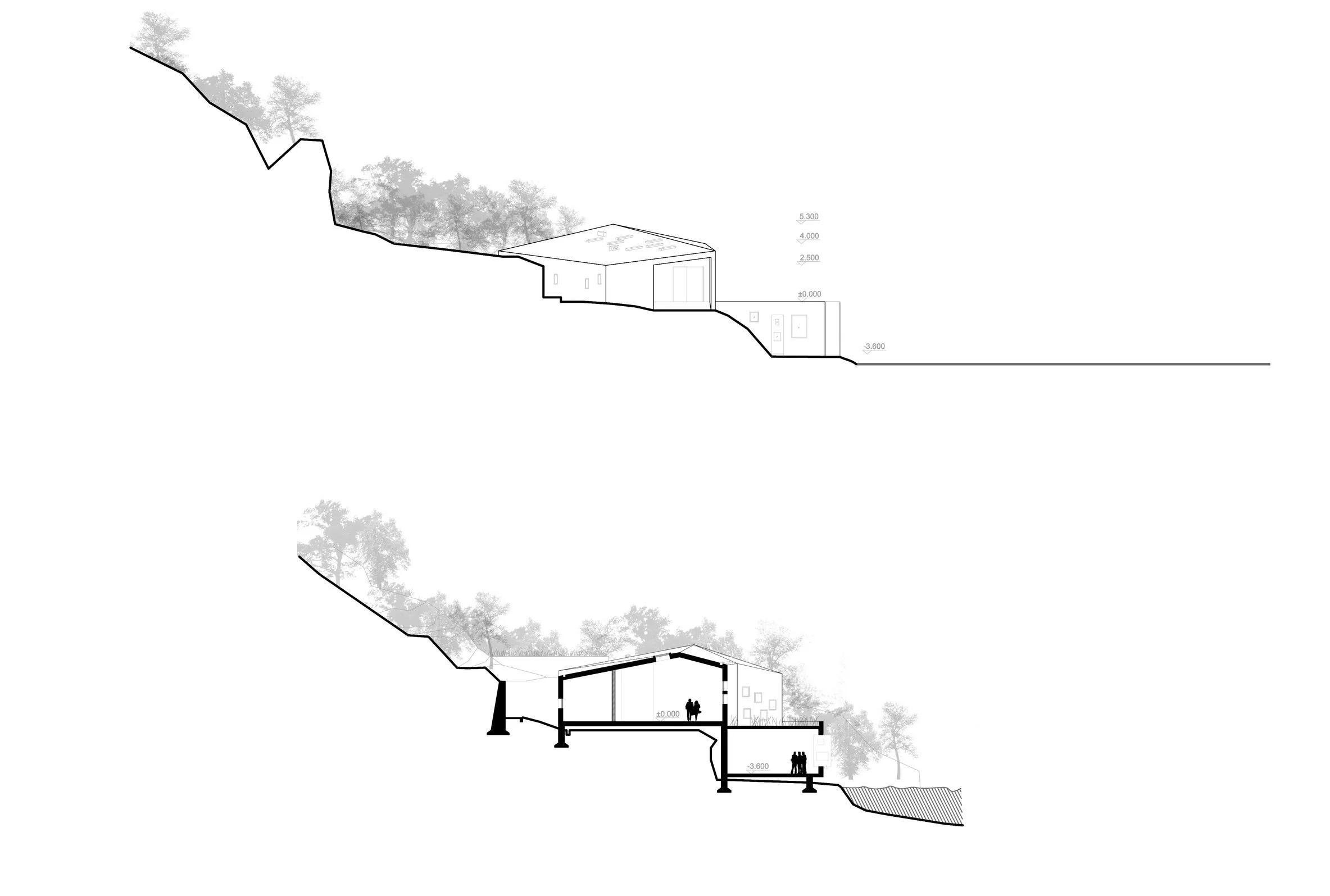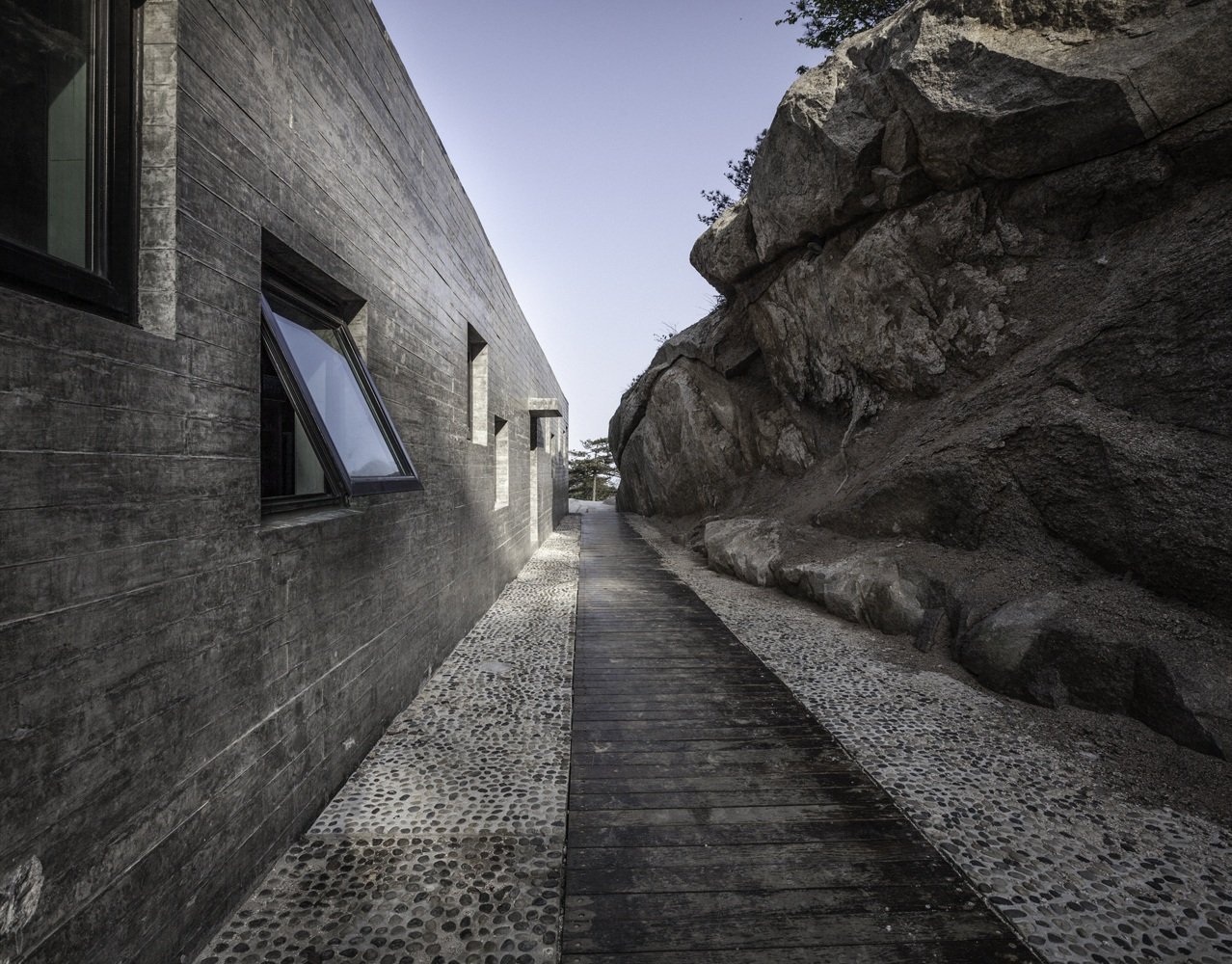 Located on a sacred Taoist mountain, this ecotourism infrastructure project benefits from an exceptional setting. In Taoist iconography, architecture is but one element of a complex composition, attesting to the human presence in an ideal context where the natural and the artificial form a coherent harmonious whole. Our project has sought to get closer to this philosophy of effacement. Thus, the building is seen as an extension of the existing topography. It bends and flexibly follows the accidental contours of the rock. A resting place for ramblers, the Tianzhushan refuge follows their pace as they enter through the first floor and continue their walk along a gentle ramp that leads to the water level. Two kinds of relationship with the surrounding nature are offered through the façades which at times frame the landscape and at other times project us into it through vast openings.