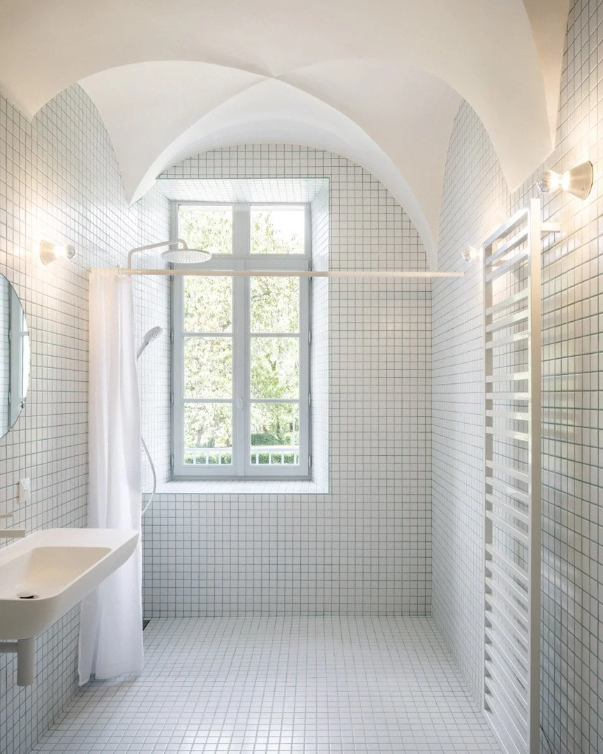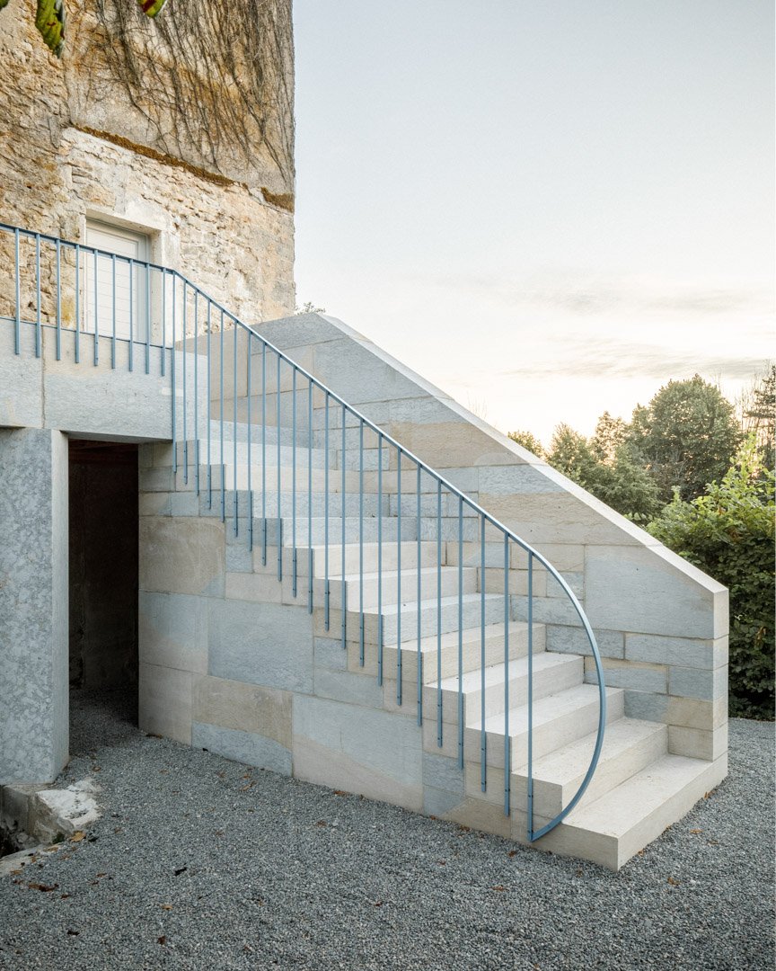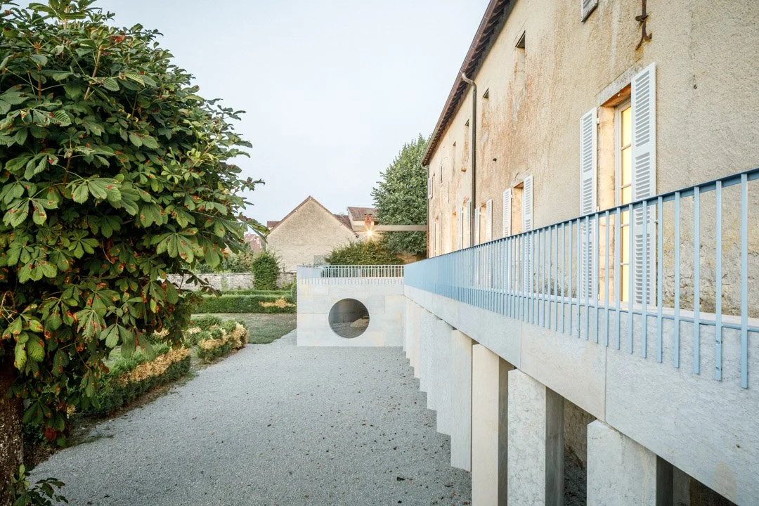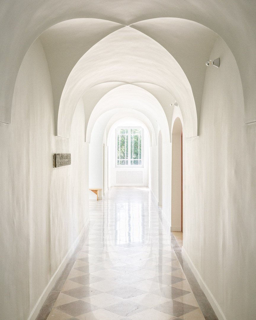 The project involves the transformation of a former convent, built for the Capuchin brotherhood dating back to the 18th century into an artist residence. The re-appropriation the place is achieved by establishing a connection between the interior spaces and the facades with the cobbled courtyard through monumental openings. On the garden side, a monumental gallery of Hauteville massive stone takes its place and provides the entire north wing a direct relationship with the landscape. Somewhere amidst built intervention and landscape intervention, this monumental gesture creates a transition between the garden at the bottom and the reference level at the top of the living spaces. Initially, there's the commanding scale of the structure, a 35-meter-long gallery, and then its materiality—crafted from solid, monolithic Hauteville stone, forming a spacious belvedere. This excessiveness echoes to the imposing volume of the convent that inevitably calls for a radical intervention. When looking into further detail, the stone gallery takes up several codes of garden art. Thus, the main angle is treated in a quarter-round, a figure found in the 20th-century garden, one of the significant layout motifs of the 18th-century convent construction period. In its contemporary declination, it ensures the formal connection between various parts realized at different periods in order to define a new overall coherence.