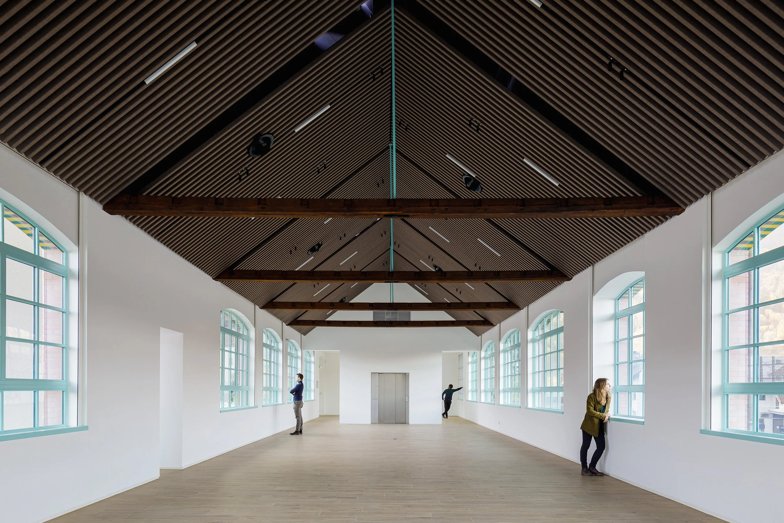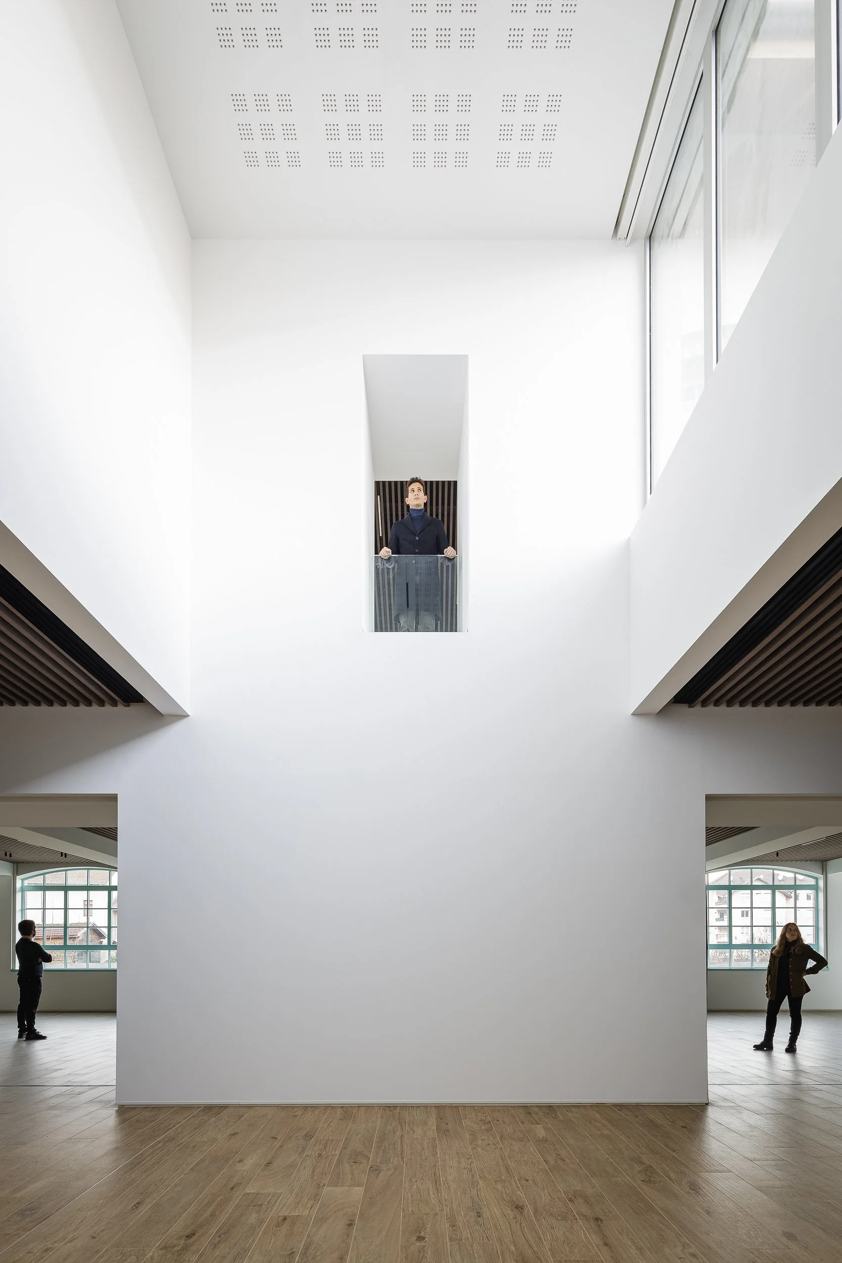 The project involved the extension and conversion of a former machining factory into an Alpex cultural center. Having been commissioned to carry out the complete assignment, we raised all the heritage issues inherent in the major transformation of an existing building designated as a local heritage site. This new cultural center is part of a wider effort to renovate the heart of the town of Scionzier. A large open space opens up between the building and the Town Hall so that, despite itself, the gable façade has become the main facade. It now closes off the new town-centre square. A generous entrance porch consisting of a colonnade made of solid Hauteville stone has reshaped the facade, designated the new entrance and signaling the building’s new public function. Inside, the black service areas in the two main exhibition rooms catch the eye. The low-arched bays allow plenty of light to enter and offer great flexibility in how the space is used. The extension, required by the project requirements, slides along the length of the building. Expressing a real sense of calm, only the saw-tooth roof, which allows constant light to enter the temporary exhibition room, is visible from the square.