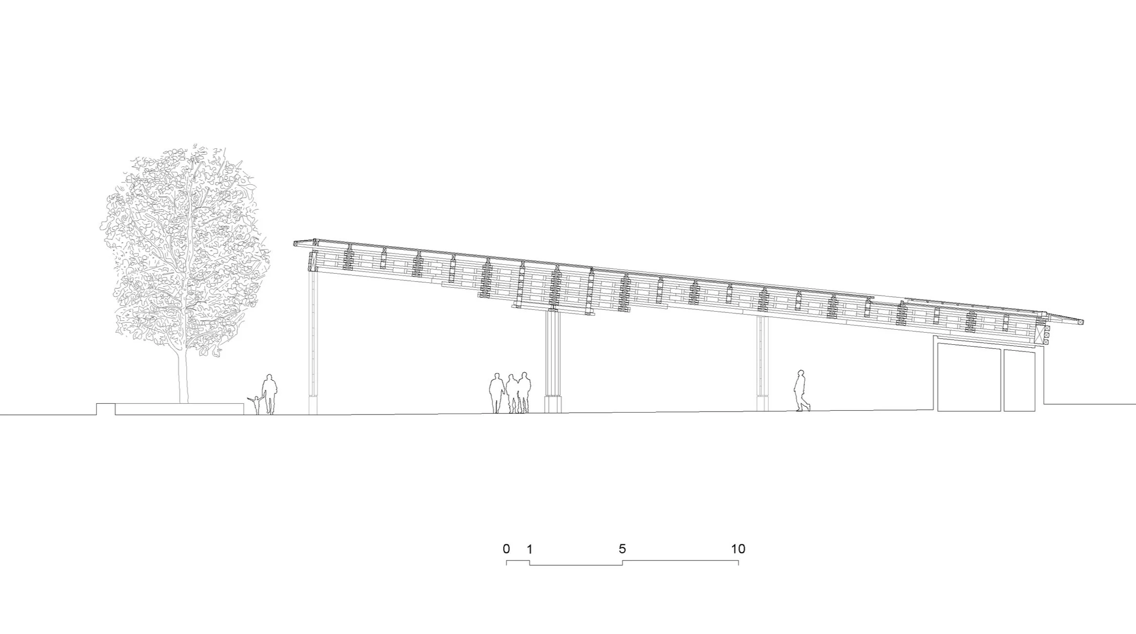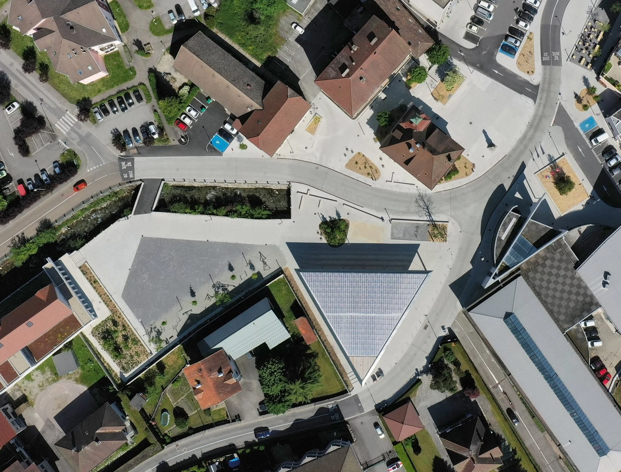 Prior to our intervention, the centre of the town lacked a strong identity, functioning mainly as a transit zone towards ski resorts and leisure activities in the mountains. Delivered to the inhabitants of the town in early 2023, the redeveloped “town heart” transformed the image of the municipality, brought new uses, revitalized the space public, and enhanced the inhabitants’ quality of life. The vast wooden market hall is the main urban element of the new development scheme. It plays the role of urban connector and signal of renewal. It relies on a calm and silent architectural repertoire, with its roof being both reassuring and grandiose. Its rigorous geometry takes the form of an equilateral triangle. Named the “Grenette de Scionzier” it is part of the new collective urban storytelling.