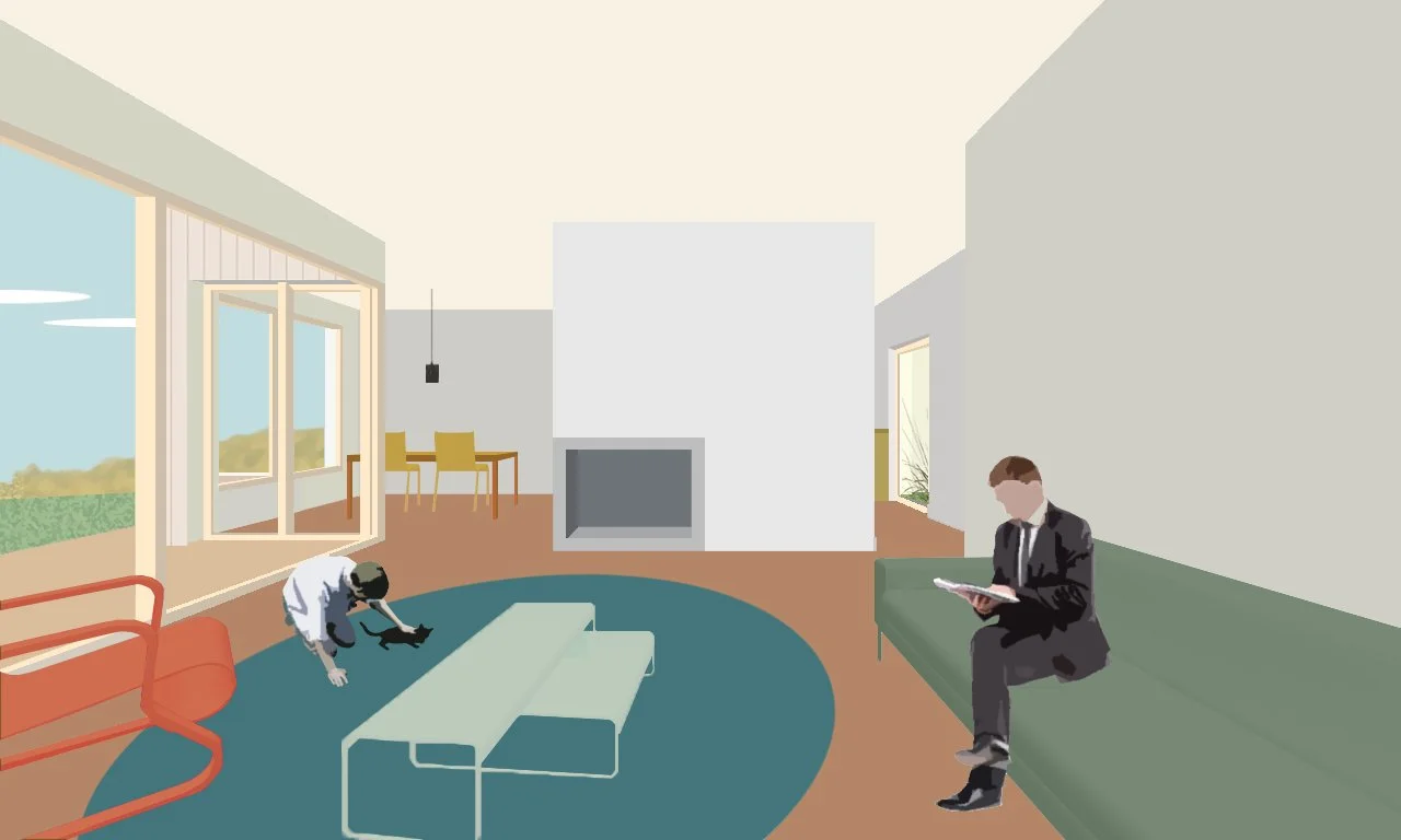 The division into two sections creates a visual breakthrough that opens onto a majestic landscape, offering a unique public viewpoint on the edge of the forest. This project reinvents the detached villa by blending tradition and modernity, with elements such as the central fireplace and veranda, which blur the boundaries between indoors and outdoors.