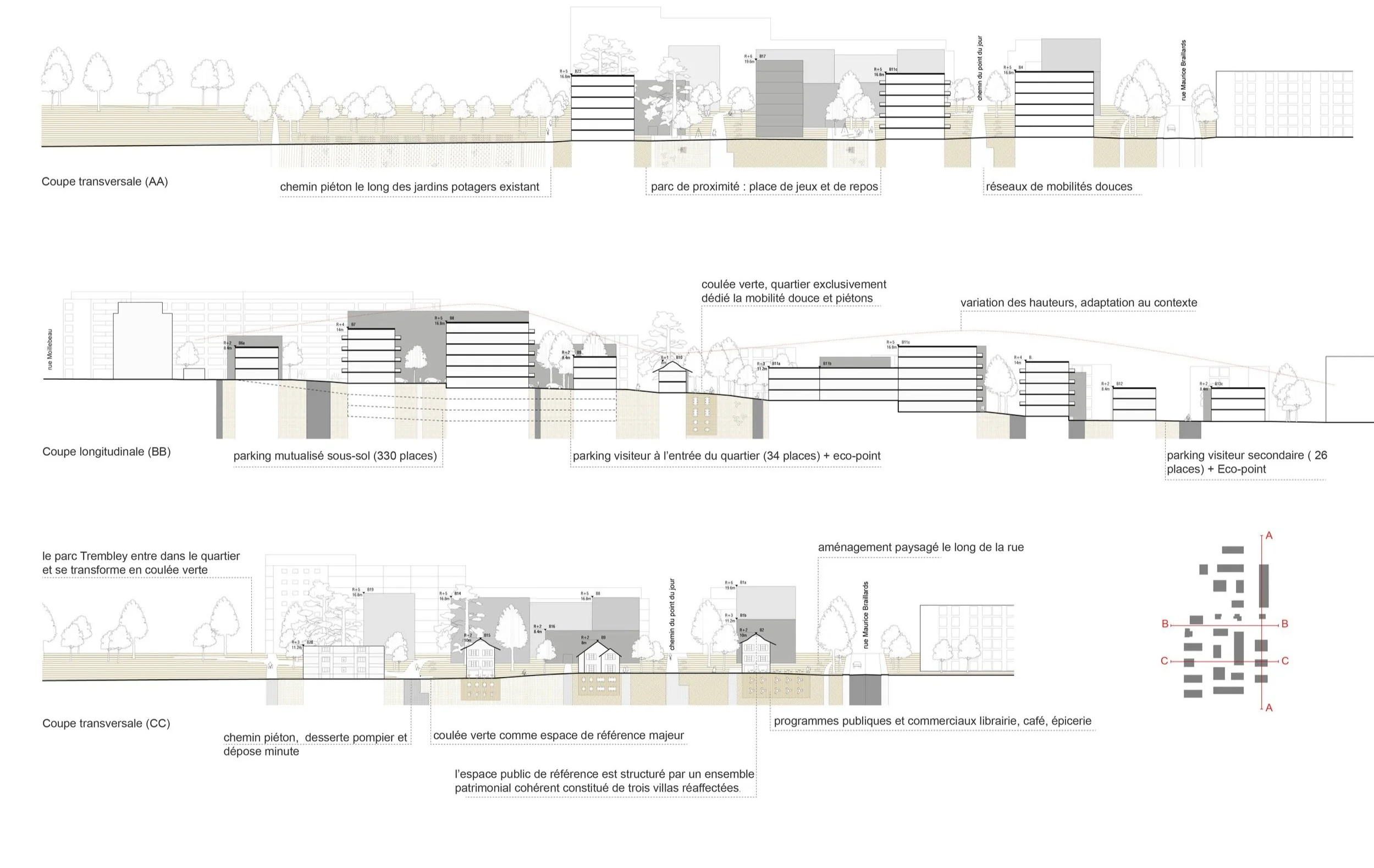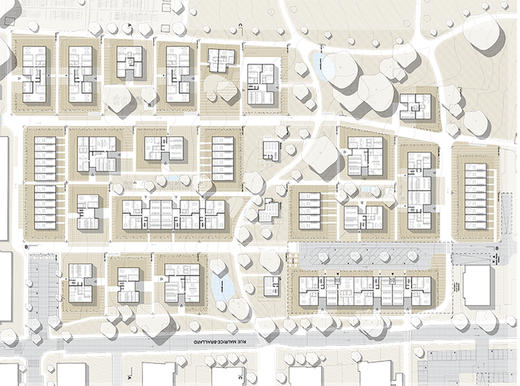 The project aims to maintain multiple relationships with individual housing despite the substantial densification that is proposed. To achieve this, we felt that the qualities of suburban neighbourhoods that are potentially sought after by several segments of the population did not lie solely in owning a detached house on a large plot of land. By preserving the plot layout, an urban ‘grain’ is also preserved. In most cases, this encourages us to envisage non-contiguous relationships between neighbouring buildings. As a result, the dwellings built on these plots may partially echo the suburban housing model, particularly in terms of their partially radiating layout.
