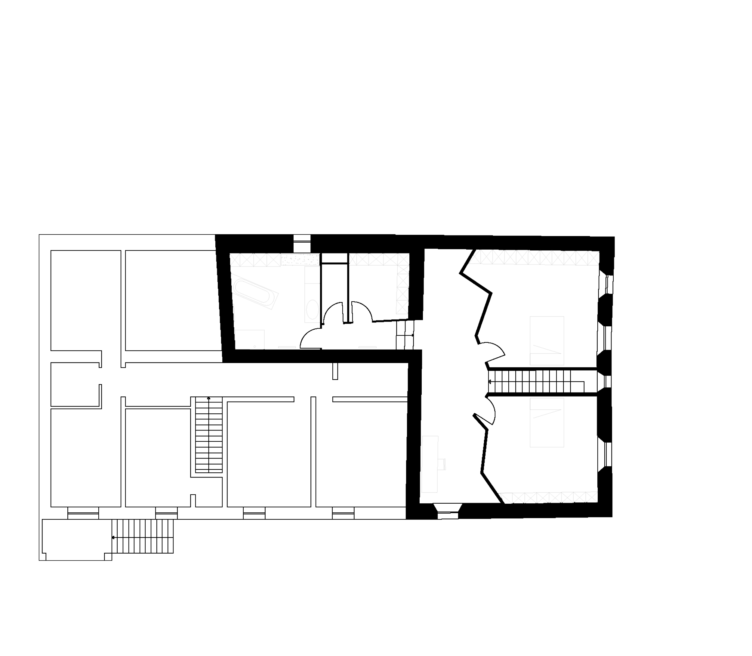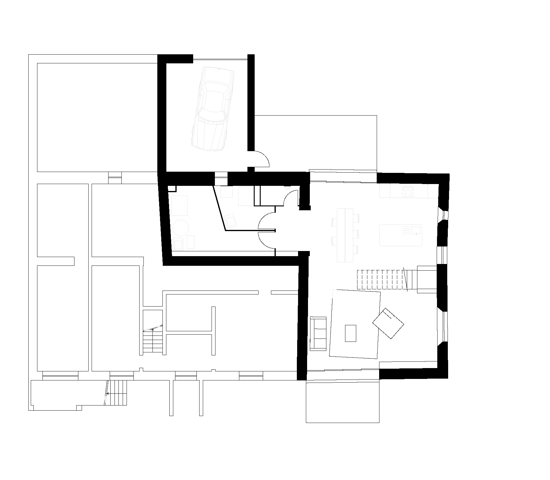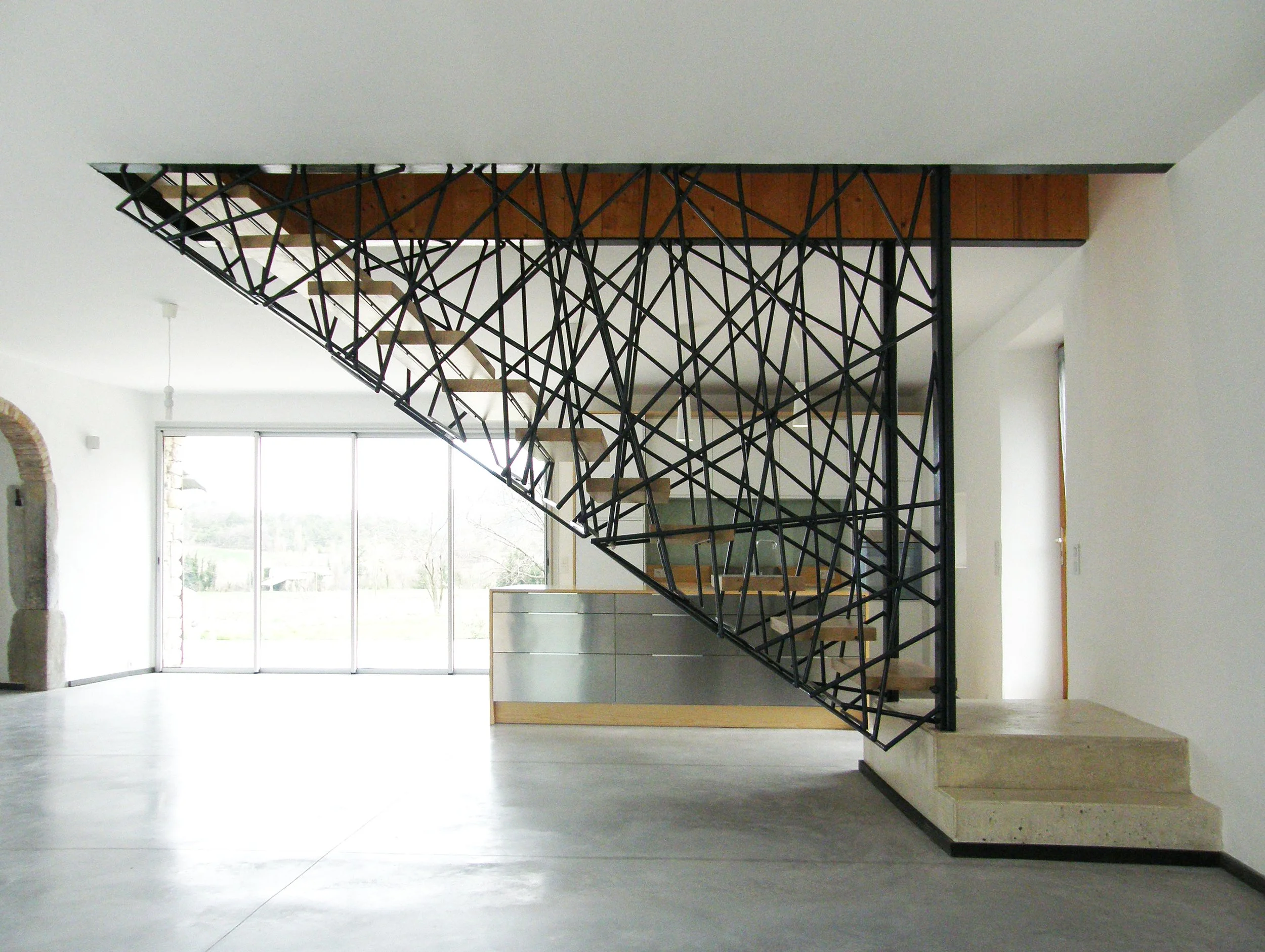 Initially, a tobacco drying barn converted into a garage, practical thanks to its 4-metre-wide opening, was transformed into a living space for a family. The key element of the project is this large passageway, which creates symmetry and a tunnel of light running through the villa.The ground floor, bright and open to the outside, contrasts with the upper floor, which is more introverted and shaded. The connection between these two worlds is achieved through the deformation of the upper slab, which reaches down to the ground floor, while respecting the specific characteristics of the site, which is listed as a historic monument.