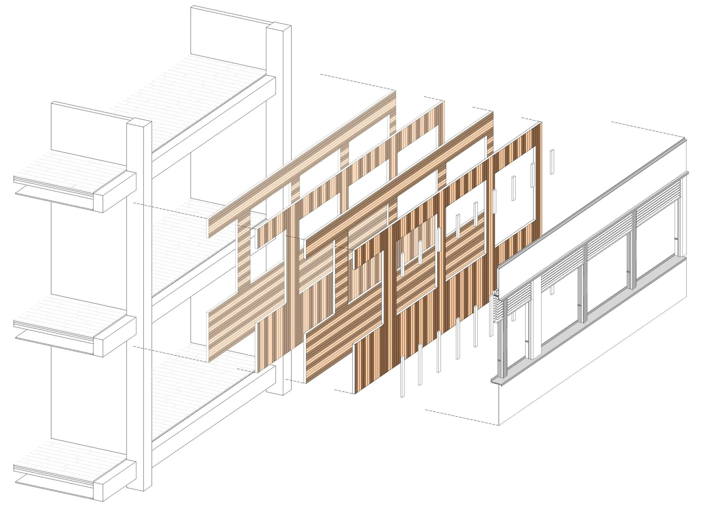 Refurbishing an office building and workshop dating from the 60's and belonging to CERN (European Nuclear Research Council). Complete replacement of the facade modules with prefabricated wooden elements.